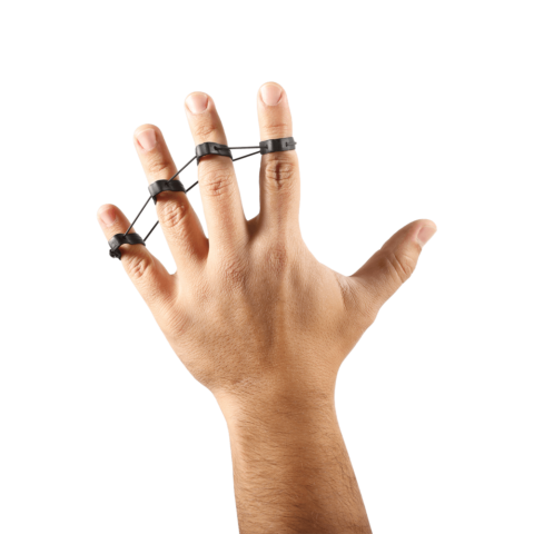 各指のリングはゴムのような伸縮性の素材でつながっており、指の動きに抵抗を加えて筋力向上を図る仕組みです。