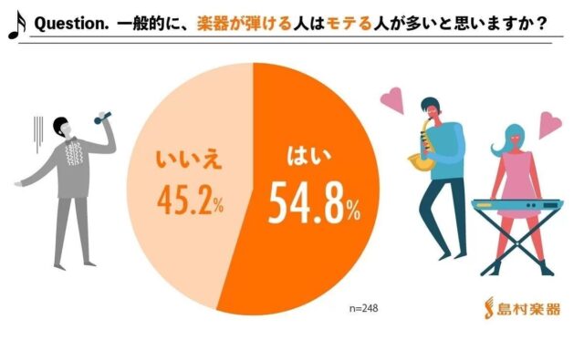モテそうなイメージがある楽器ですが、実際モテる人が多いかという質問に対しては、YESが54.8%とわずかにモテると思う人が多いという意見が多かったようです。