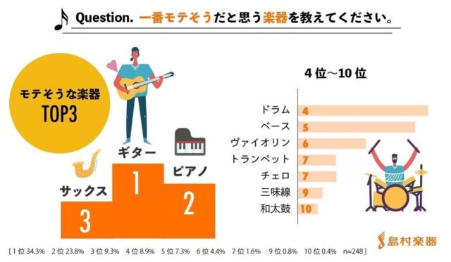 この調査は島村楽器によって2022年2月2日から4日にかけ、楽器とプレイヤーに詳しいアルバイトと従業員を対象におこなわれ、248名の回答を得ました。