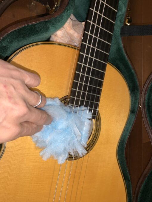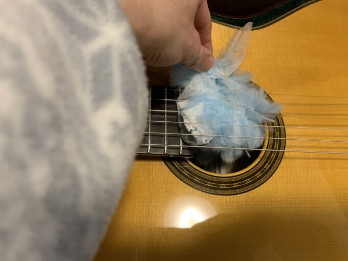 このハンディワイパーを使った方法だと柔らかいので弦を外す必要もなくサウンドホールから中に入れられます。