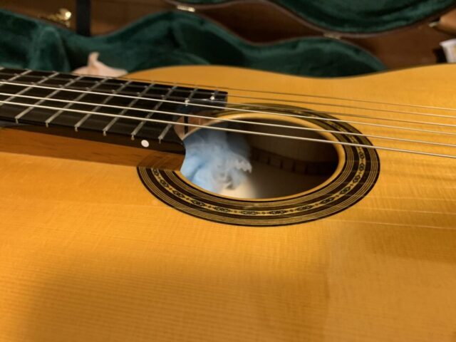 サウンドホールはそれほど大きくないのですごい勢いでたまるというわけではありませんが、気づかないうちにゴミがたまり、綿埃が見えることもしばしばです。