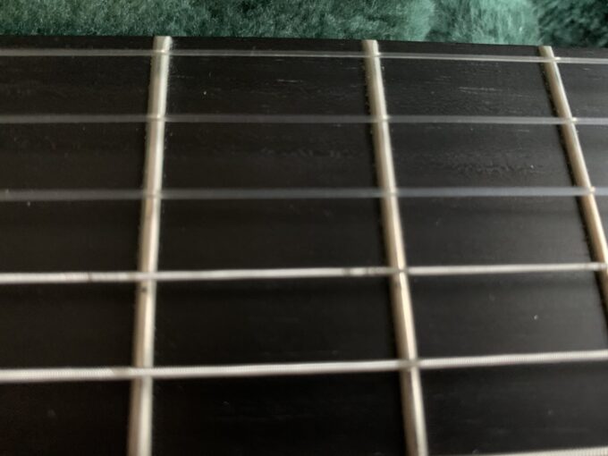 もちろん、指板のうえにもほこりはたまります。また、弦の裏も掃除はしにくいでしょう:
