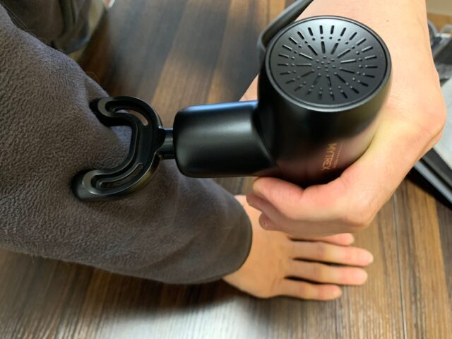ただ、指や手の甲など、骨が多い場所に使うにはマッサージガンは大きく強すぎます。こういうところはハンドマッサージャーの方がいいと感じました。