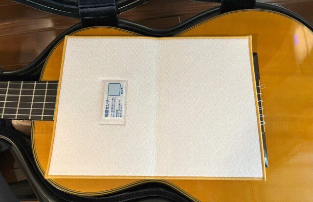 こうやってギターの表面板を覆う形で置いておくことで、表面板はもちろんホールの中の湿度調整にも役立つでしょう。