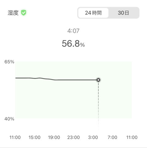 比べていただくと、部屋の湿度は67%から73%まで大きく変化しているのに、ギターケース内部は57%付近でほぼ一定なのがわかるかと思います。