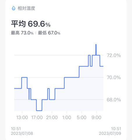 つまり、ずっとケースに入れっぱなしだったわけではなく、17時頃に2時間ほど湿度の高い空間で弾かれたギターにもかからず、17時以降も湿度がほとんど変化していない、ということです。
