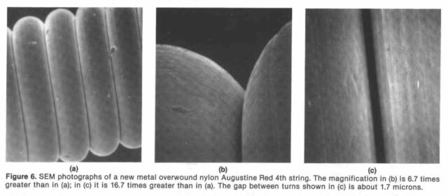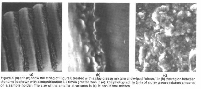 この論文の結論としては、ギターの低音弦の音が劣化する原因は、巻き弦の巻きの間に存在する1ミクロン以下の異物なのだそうです。