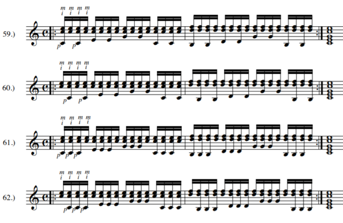 このアルペジオ、名前の通り120ものパターンがあります。アルペジオの練習としてよく使われるアグアドのものが16しかないのに比べるとかなり多いです。