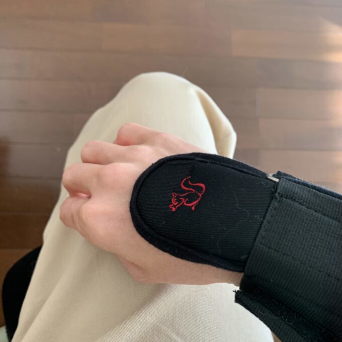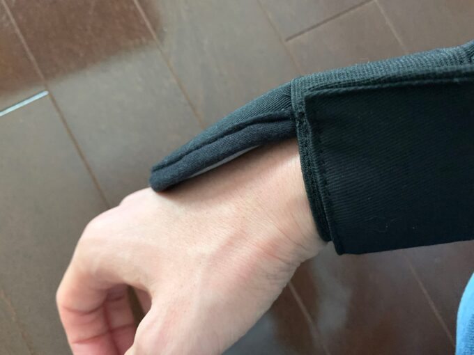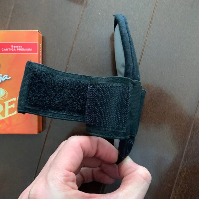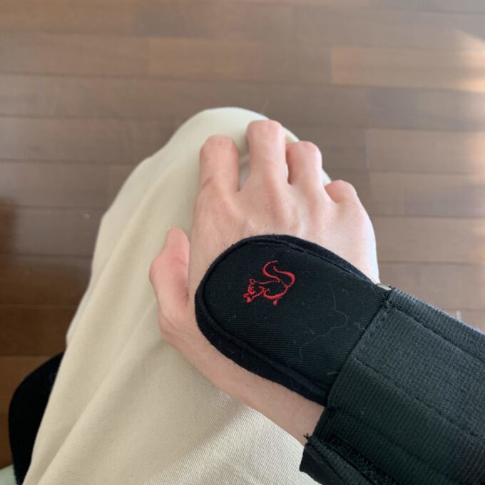 手にはベルクロを使って巻き付けて使います。手の甲が傾いた部分に当たり、手首の前後方向の角度を制限してくれます。また、傾けすぎると手の甲との間に隙間ができるのですぐわかります。