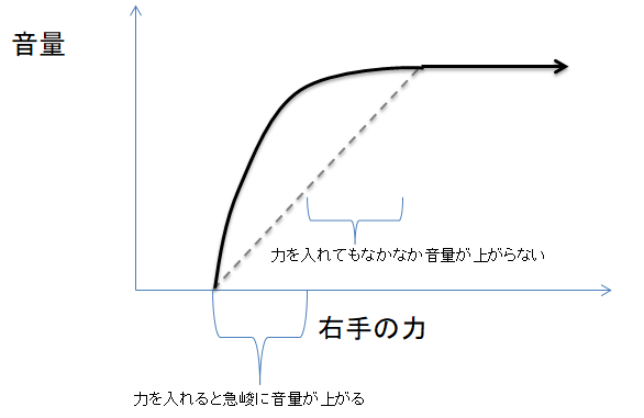 実際には以下のように、音が出始めるところから力を加えると急峻に音量が上がり、だんだんと力を入れても音量が上がらなくなります: