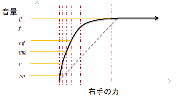 理想的なクラシックギターの右手の力と音量の関係は以下のようなものかと思います: