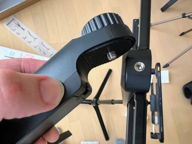 取り付け場所は上で紹介したカプセル譜面台上部のネジ穴、あるいは譜面置き場下のネジ穴です: