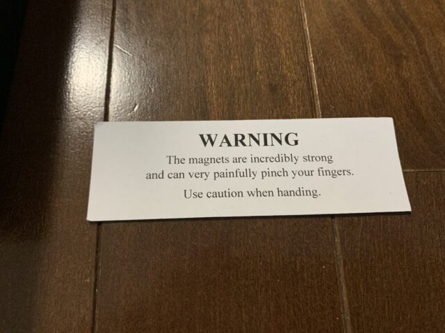 注意書きには「とんでもなく強力な磁石なので指を挟むと非常に痛いから気をつけて」と書いてあります。