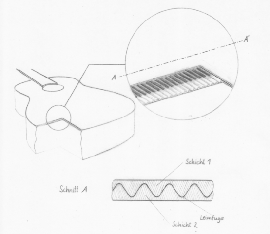 上の絵がEnhanced Woodの構造を示しています。”Schicht”は層、”Leimfuge”は接着剤を意味し、波型に削った木を重ね合わせてその間に接着剤を入れています。カーボンファイバーについてはこの絵では触れられていないようです。