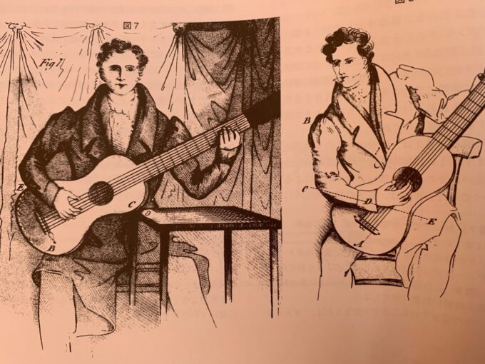 上の図はソルがギターをどのように構えるべきかについて解説している図です。ソルは左のようにギターの角を机の角において保持する方法が一番いいと考えていたようです。