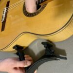 ギター用支持具の多くは吸盤やクランプ(万力)でギターに固定しますが、Z-SKINNYは両面テープでギターに取り付けます。