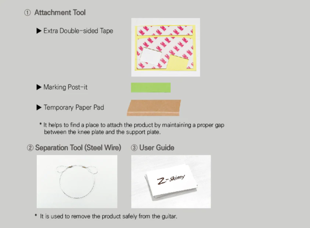 既存の吸盤、クランプ、磁気といった固定方法は音に干渉するとZ-SKINNYは考えており、ギターとの接触面積を極限まで減らす方式として両面テープを採用したのだとか。