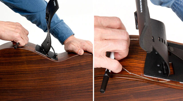 両面テープを使うと楽器の塗装面へのダメージが気になりますが、あえてこの方式を使ったのは音への影響を避けるためだそうです。