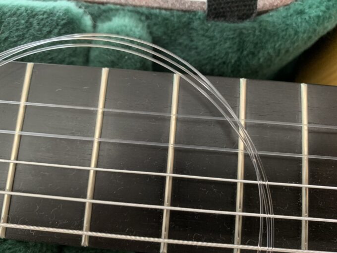 上に乗っているのがClaroの1弦、張ってある2,3弦がGPXです。見た目的には、透明感のある1弦に対して、2,3弦は少し半透明。といっても、いわれないと気付かないくらいです。