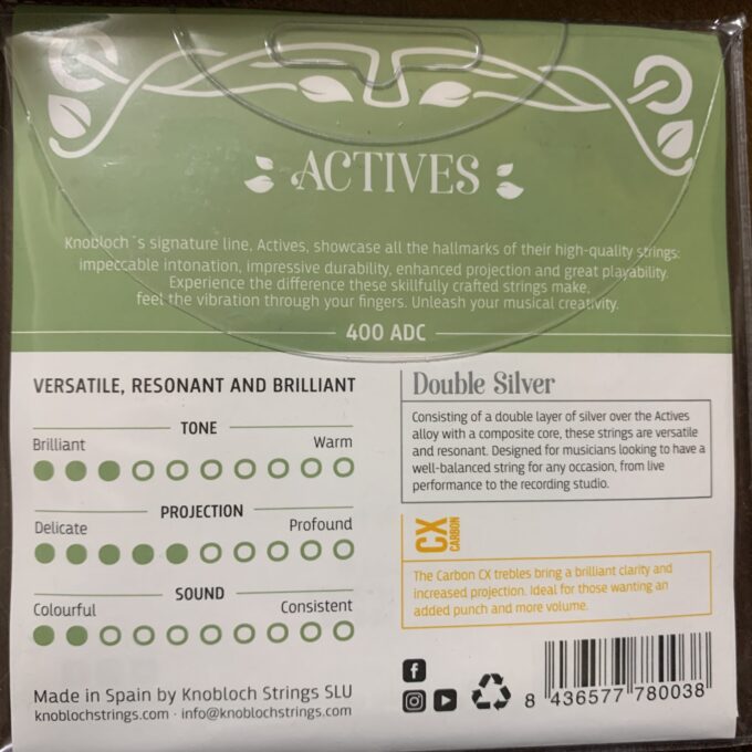 以下の記事でも紹介しましたが、ノブロックの弦には3つのラインがあります。そのうち、低音弦の芯線にナイロンとカーボンのコンポジットを使っているのがアクティブスダブルシルバーです。