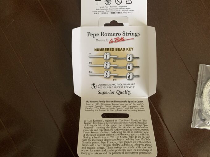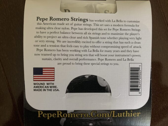 裏面にはペペ・ロメロジュニアとラベラがこの弦を作ったことや、6つの弦のバランスを完璧にし、強く引いても弱く弾いてもクリアでリッチなスパニッシュトーンが出るように開発されたことが書かれています。