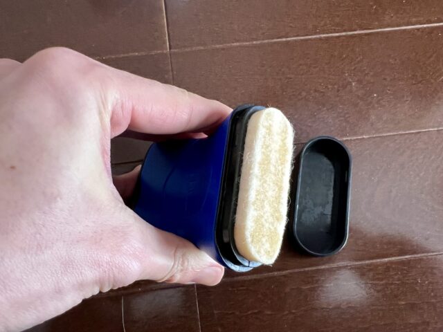 フタを開けるとなかに潤滑液がしみこんだスポンジが入っており、これを弦に押しつけて塗るという仕組みです。