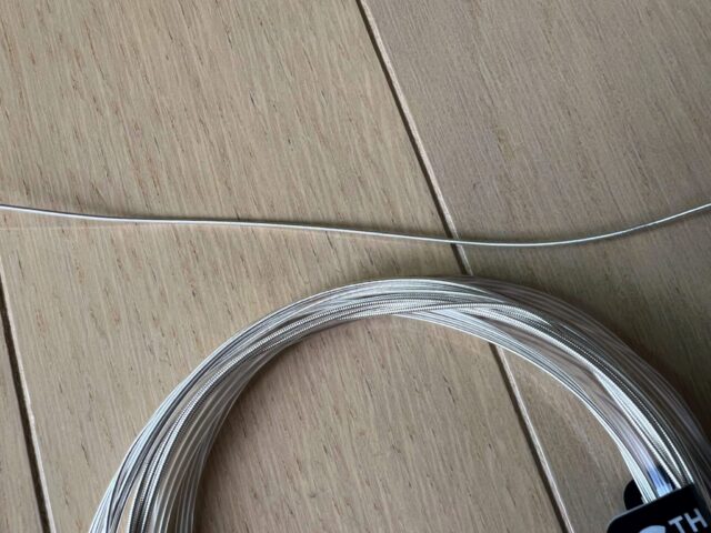 下の写真の巻いてあるのがGSC28、上に置いてあるのがサバレス カンティーガプレミアムの低音弦です。