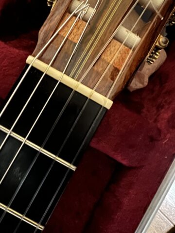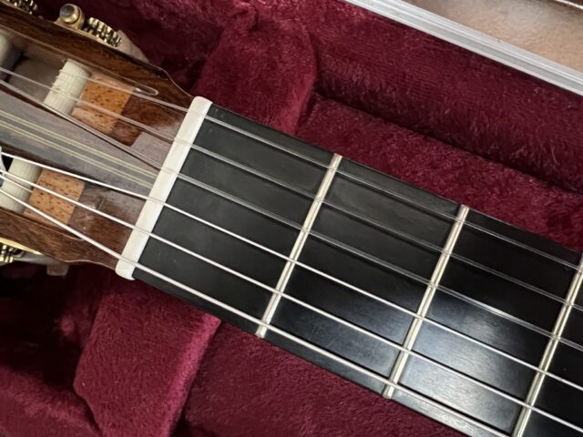 こちらが新しく作り直してもらったナットを使ったギターの写真ですが、上の写真と比べてもらえると1弦から指板端までの間隔が広くなったことがわかります: