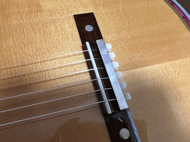 私が最近購入したハウザーIII世は音は良いのですが、1弦が前に比べてよく弦落ちする点が気になっていました。点検してもらったところ1弦と指板端の間隔が狭すぎるとのことで、ナットを新しく製作してもらうことに。サドルとあわせて当日中に完成する日帰り修理をおこなったので経緯を紹介したいと思います。