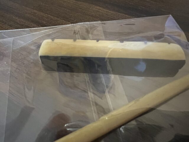 ナットだけ作ってもらえば弦落ち対策としては十分なのですが、上で書いたとおり油漬けの黄色のナットとサドルが使われているので、片方だけ白い水牛骨になるのは違和感があります。