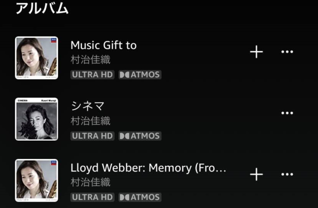 一番の有名どころでは村治佳織の「シネマ」、「Music Gift to」がDolby Atmos対応です(「ATMOS」というマーク付き)。