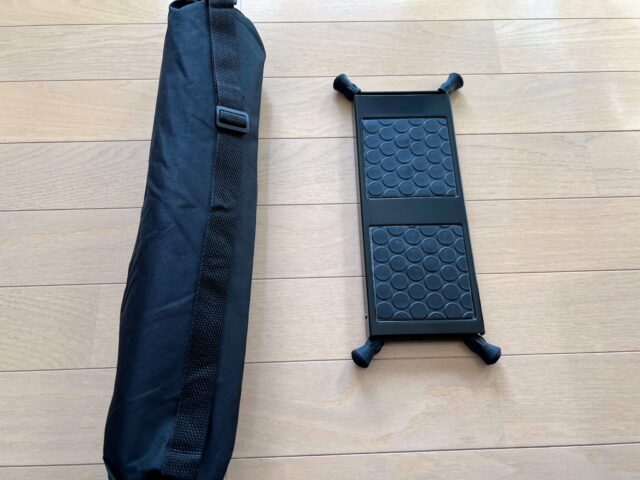 しかも、折りたたむと非常に小さくなり、かばんにも簡単に入るサイズに。下の写真に写っている足台と比べてみるとその小ささがわかるかと思います: