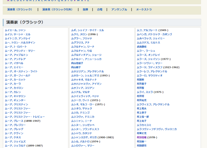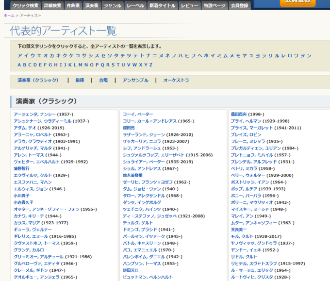 Naxosミュージックライブラリのトップから「演奏家」タブを押します。すると、以下の画面になりますので、頭文字を選びます。