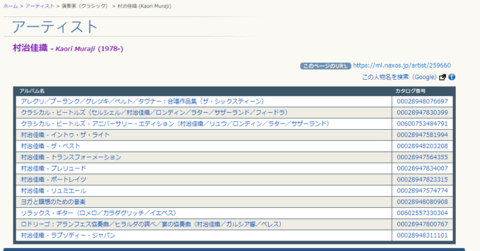 「村治佳織」をクリックするとこのようにアルバム一覧が出ます: