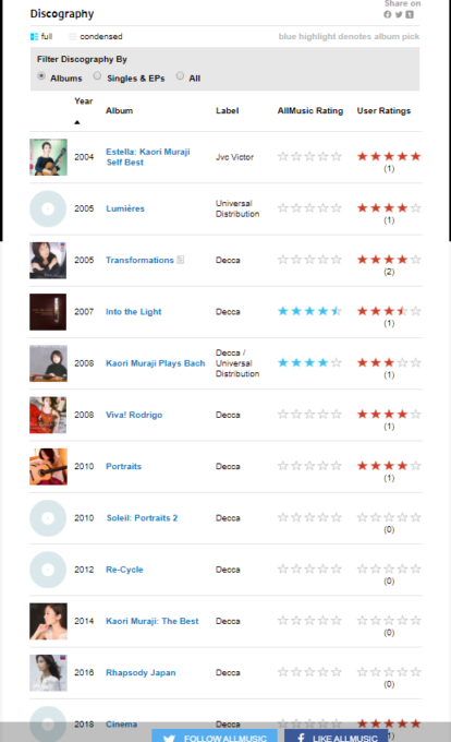 こちらで”Kaori Muraji”で検索し、Discographyを出すと、以下のようにNaxosよりも多くのアルバムが表示されます。