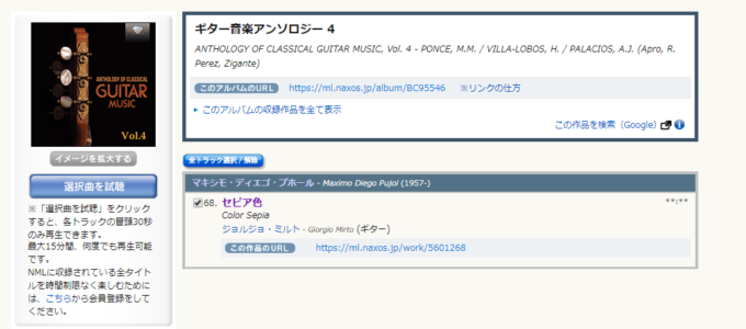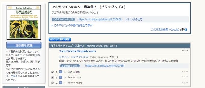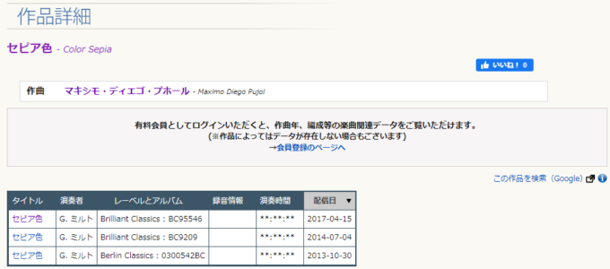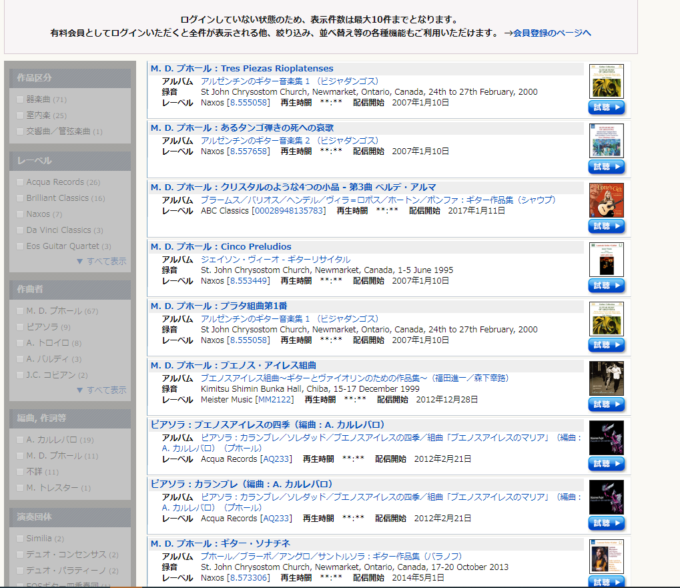 このNaxosミュージックライブラリは有料会員なら音楽も聴けます。しかしながら、有料会員でなくても検索には利用できます(ナクソス的には不本意でしょうが。。。)。