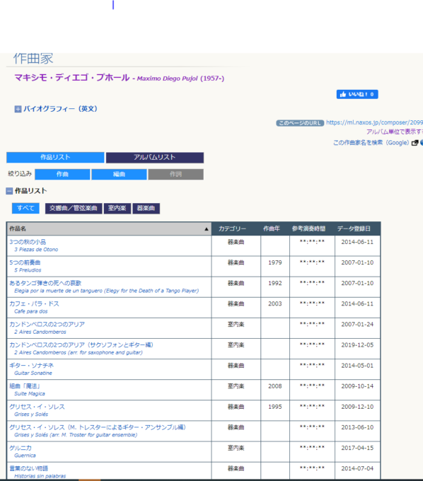 そして、出てきた作曲者名(マキシモ・ディエゴ・プホールというところ)をクリックすると、以下のように作品リストが出てきます: