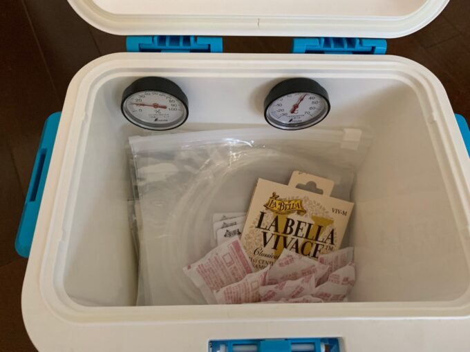 そんな弦を保存するにはクーラーボックスとシリカゲルです。