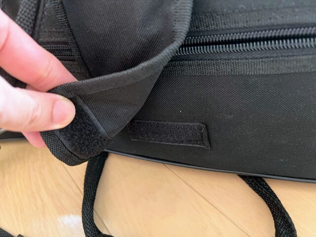 たとえば、ジッパーを閉め忘れたときに不要に開くことを防ぐための帯は、スーパーライトケースではしっかりした金属製のロックですが、SCC-100はベルクロです: